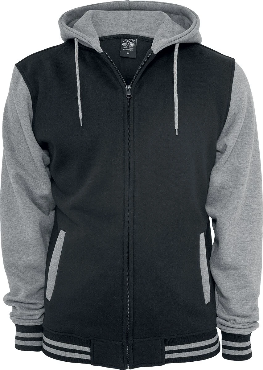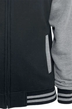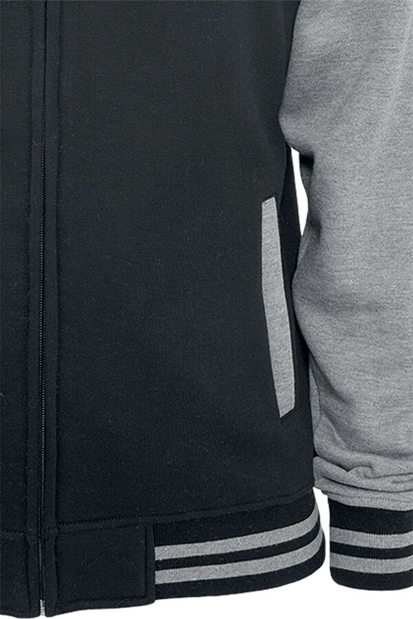 Tweekleurig vest in collegejackstijl met capuchon, twee steekzakken en gestreepte zomen. Kwaliteit: 380 g/m²