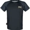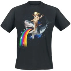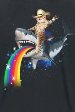 Voor alle prettig gestoorde mensen onder ons: Heb je je ooit een voorstelling gemaakt van een blije kater met een cowboyhoed op, die het universum verkent op een haai die een regenboog uitkotst? Niet? Daar komt dan nu verandering in! Dit zwarte ‘Bucking Sharkaroo’-shirt van Goodie Two Sleeves mag niet in je kledingkast ontbreken!