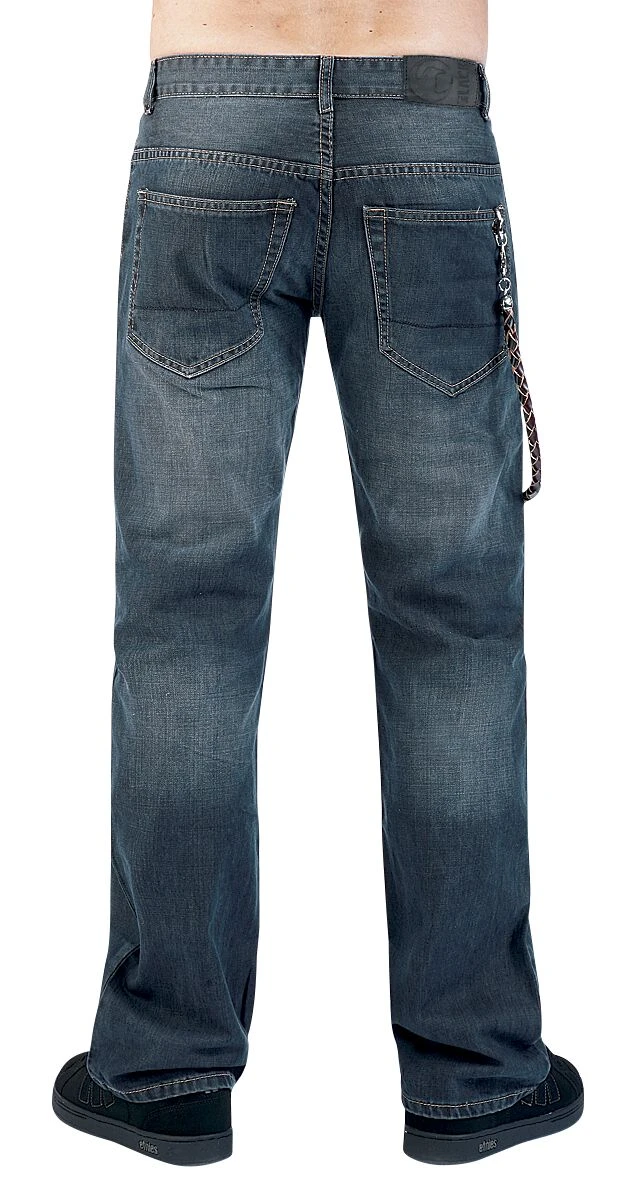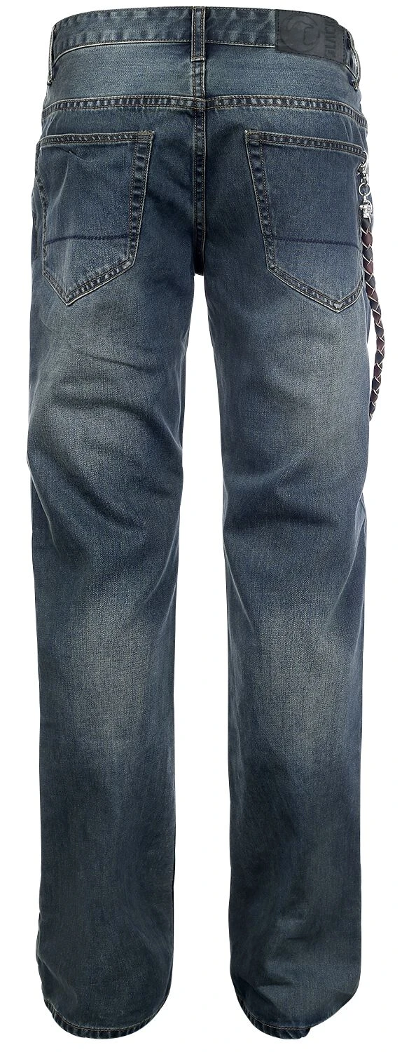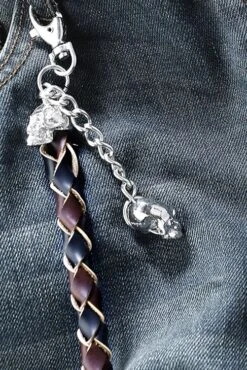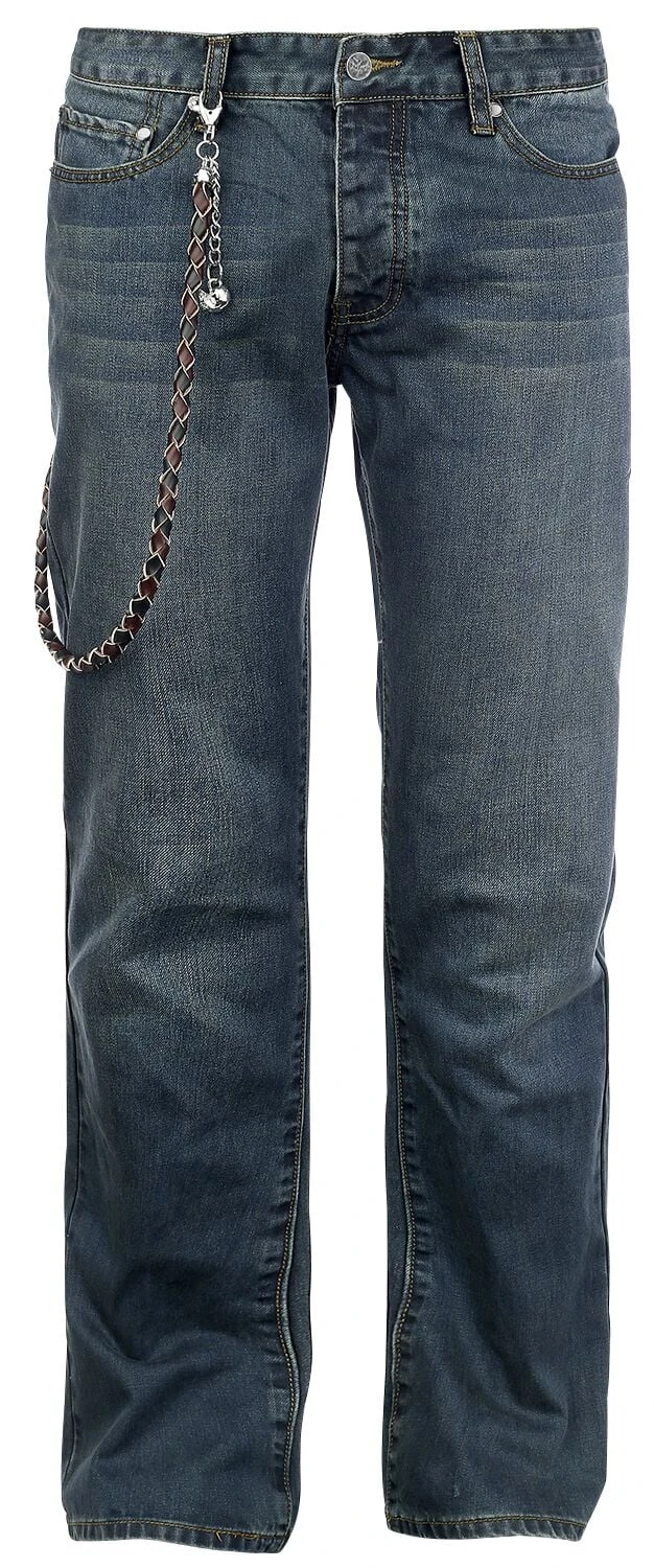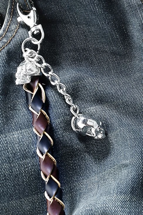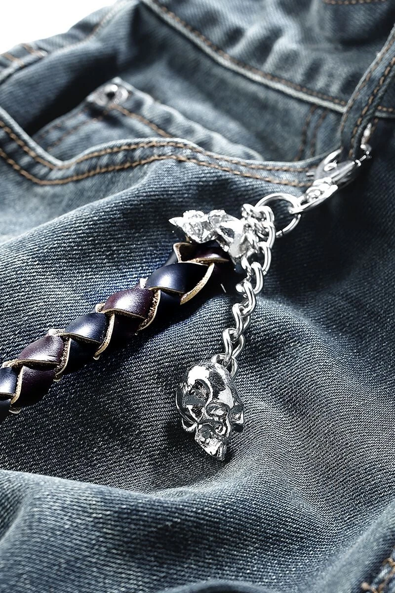 Premium vintage jeans met 5 pockets, gevlochten lederen koord met skull iconen aan beide uiteinden. Het lederen koord is ca. 75 cm lang.