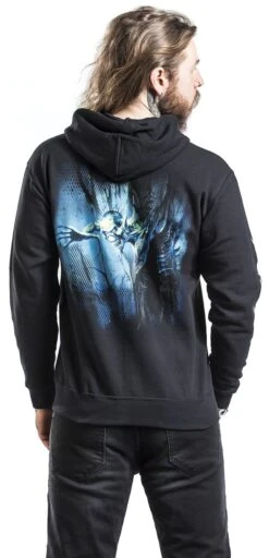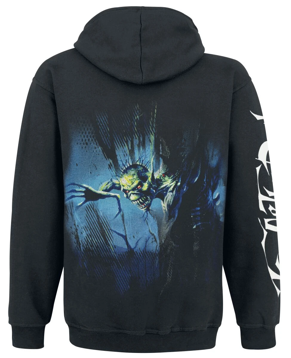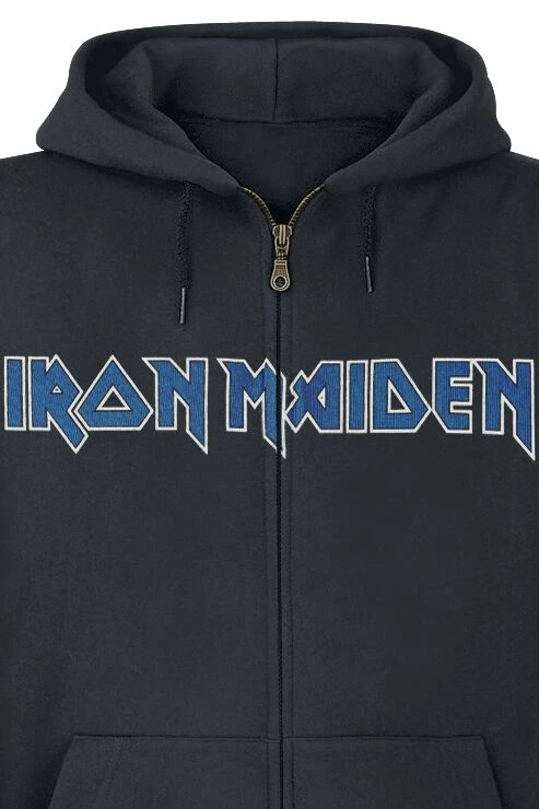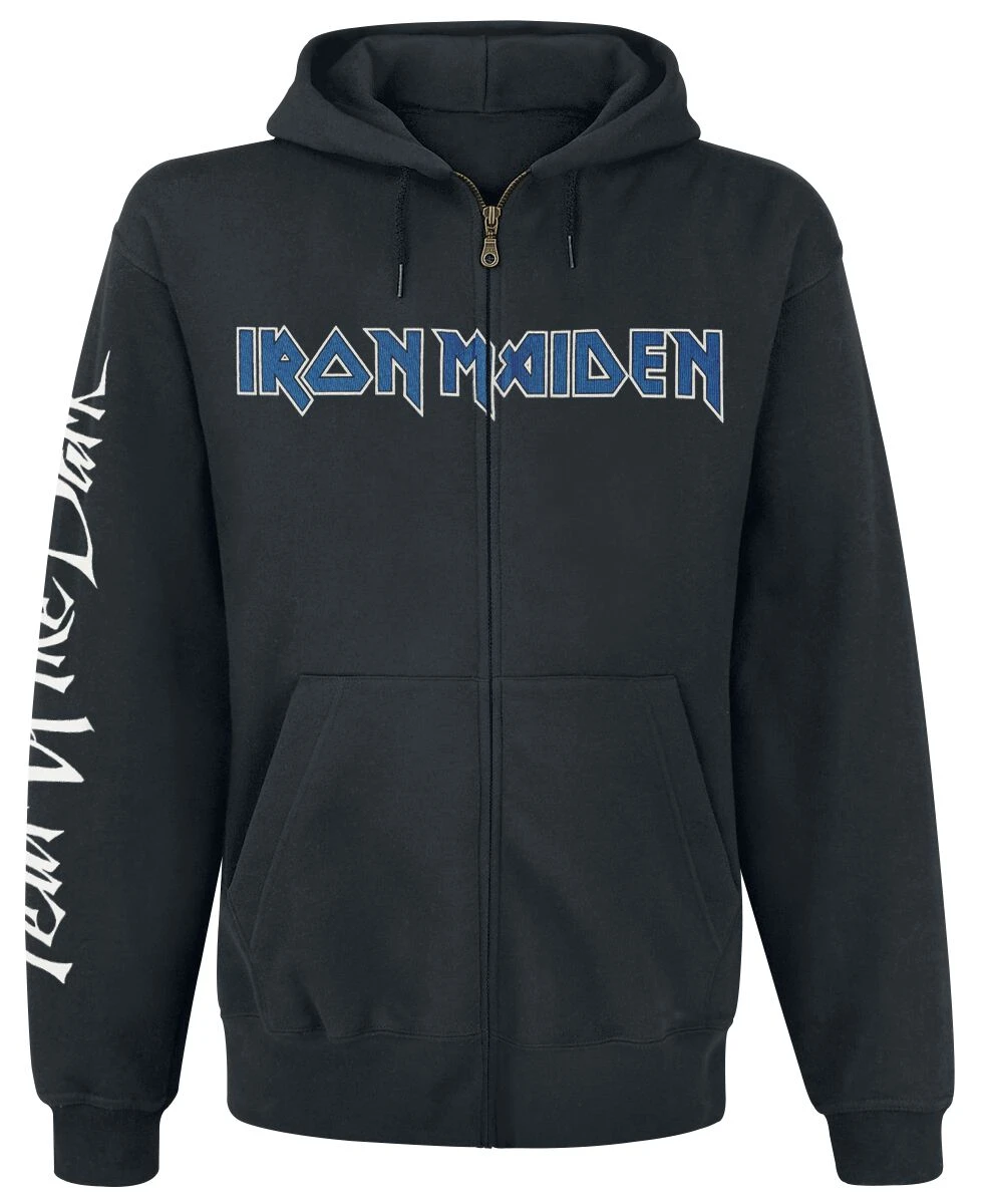 Waanzinnig vest met capuchon van Iron Maiden! Op de voorkant staan de bandletters, op de mouw staat de albumtitel en op de achterkant staat een print van de cover van het album “Fear of the Dark”. Het kledingstuk zelf heeft een capuchon met trekkoord en een praktische kangoeroezak.