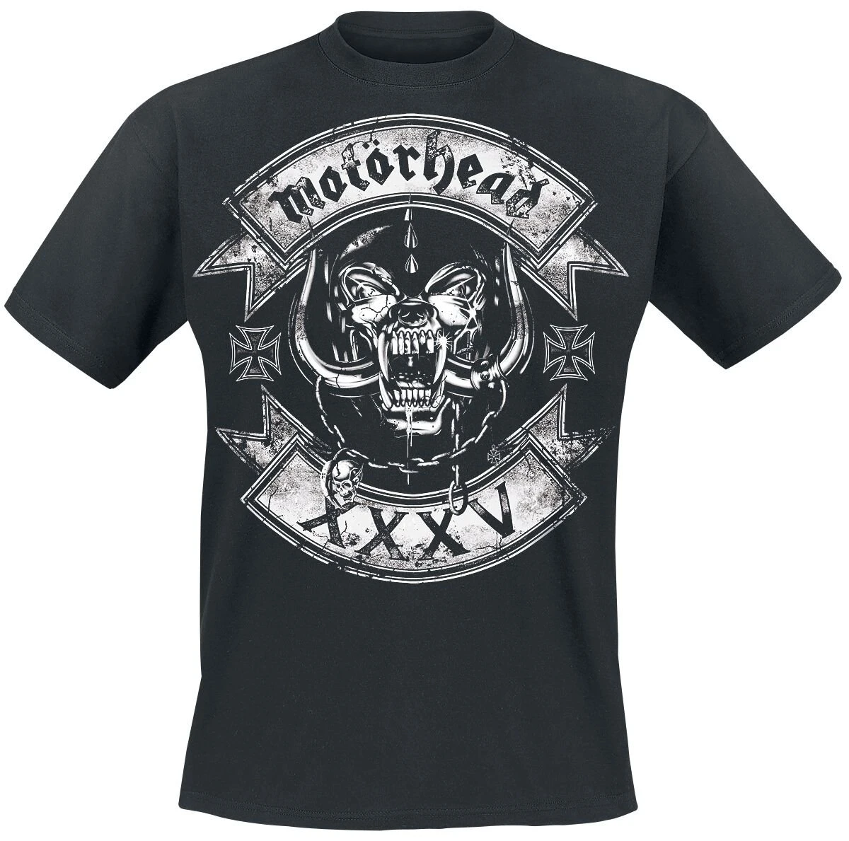 Fans van Motörhead opgelet, het zwarte T-shirt “Rockers Logo” is alleen verkrijgbaar bij Large! Dit shirt werd uitgebracht voor de 35ste verjaardag van de band en heeft een opvallende print van bandmascotte Snaggletooth met een IJzeren Kruis aan beide zijkanten op de voorkant. Onderaan zie je het Romeinse cijfer “XXXV” en bovenaan staan de herkenbare bandletters van Motörhead. Ook op de achterkant staat en print van een IJzeren Kruis en van de bandletters.